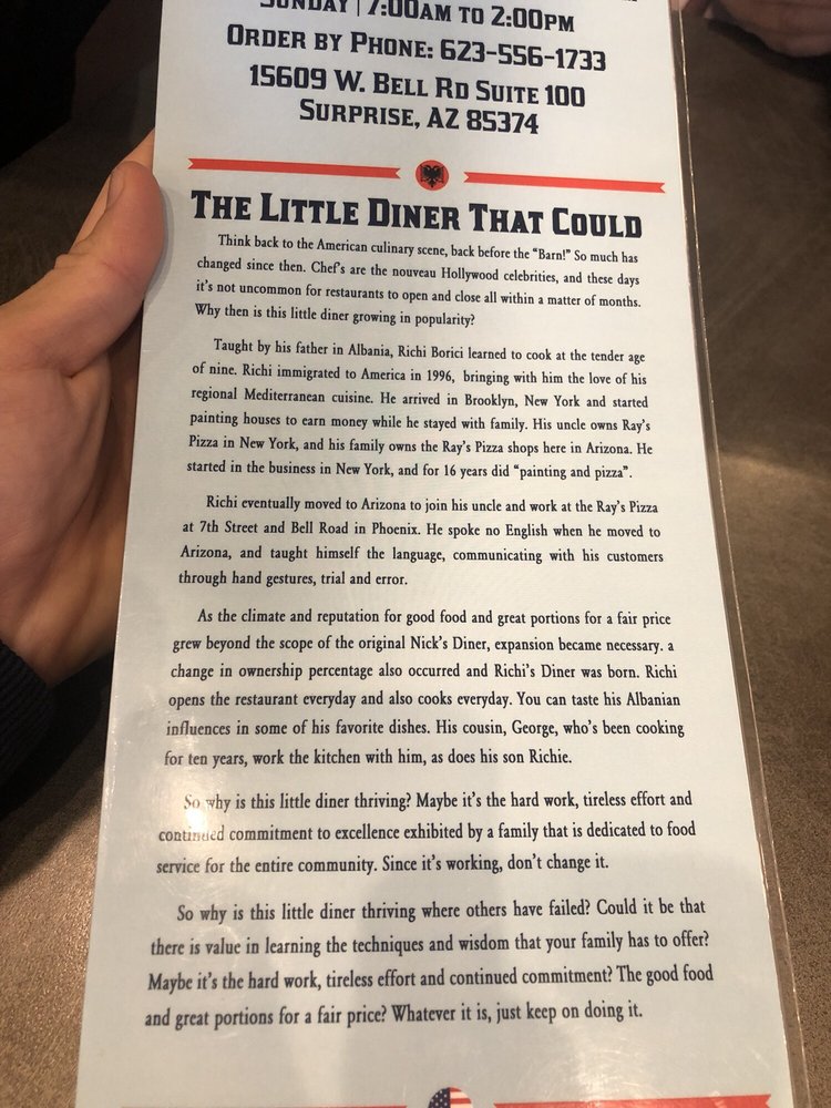Richi’s Diner is a family-owned Italian breakfast and brunch spot in Surprise, Arizona. With a casual atmosphere and friendly service, this diner offers a variety of vegetarian options and generous portions. Customers rave about the fresh and tasty dishes, such as the cheesesteak, veggie scramble, and meat lovers skillet. The menu also features happy hour specials, a full bar, and outdoor seating options, including a heated area. Additionally, Richi’s Diner is wheelchair accessible and even has designated parking spaces for Purple Heart recipients. If you're looking for a welcoming and delicious dining experience, Richi’s Diner is highly recommended by satisfied customers for its flavorful food and accommodating service.